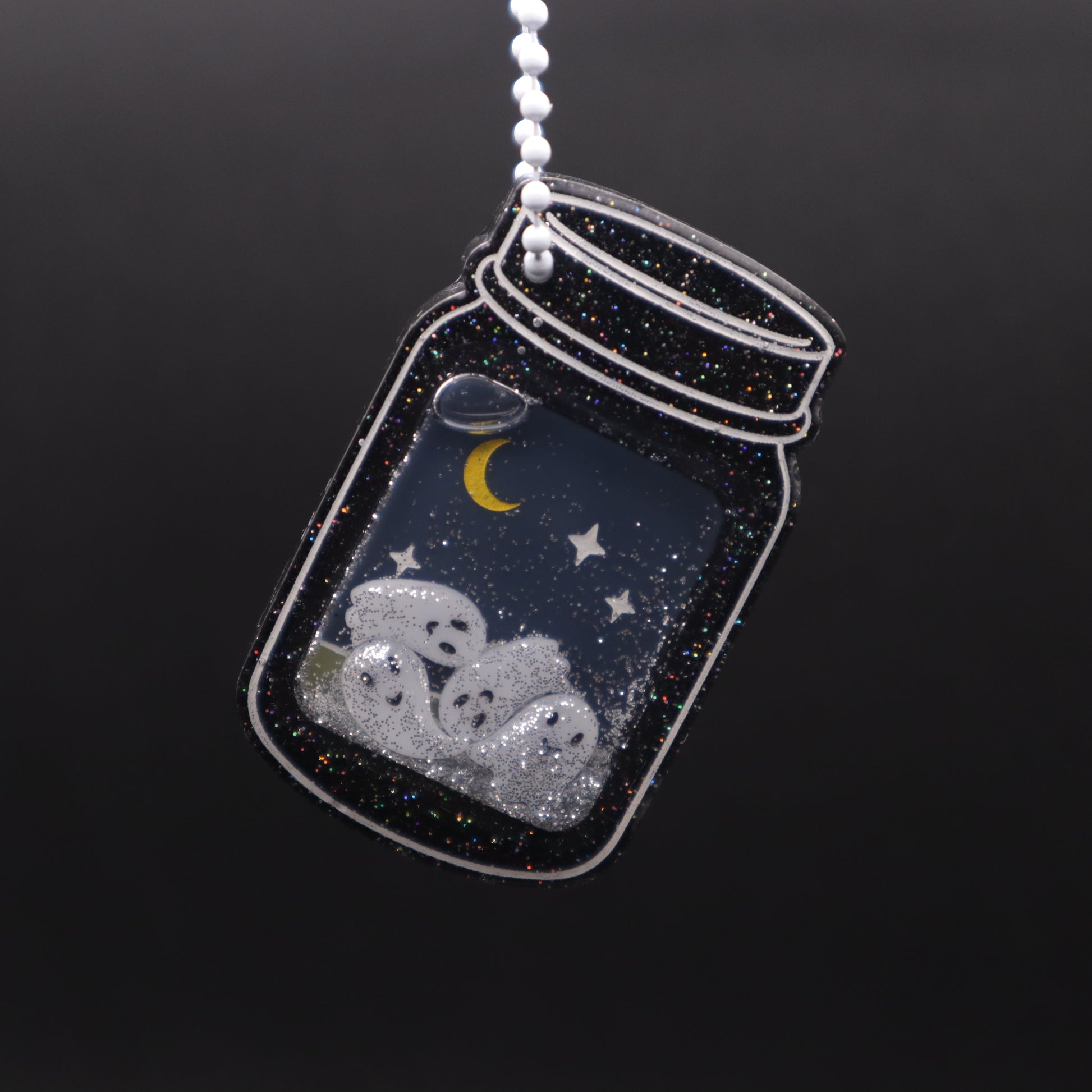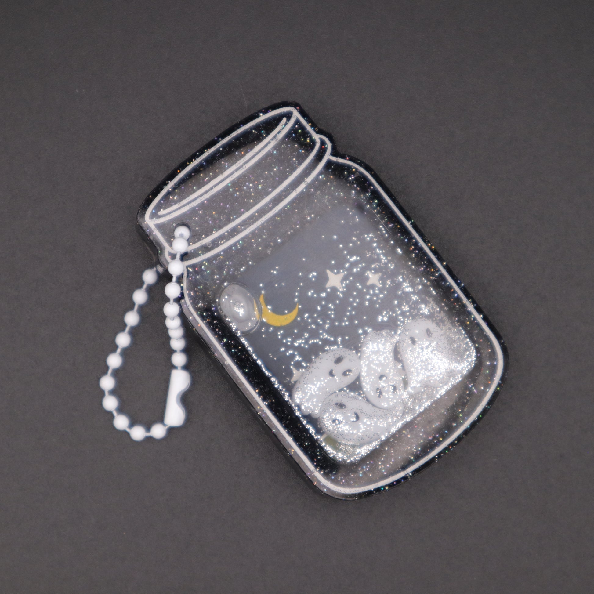 The Graveyard Ghosts Jar Shaker Keychain is made of resin and features a black holographic glitter base, white ghost bits, silver glitter, and a white bead chain.