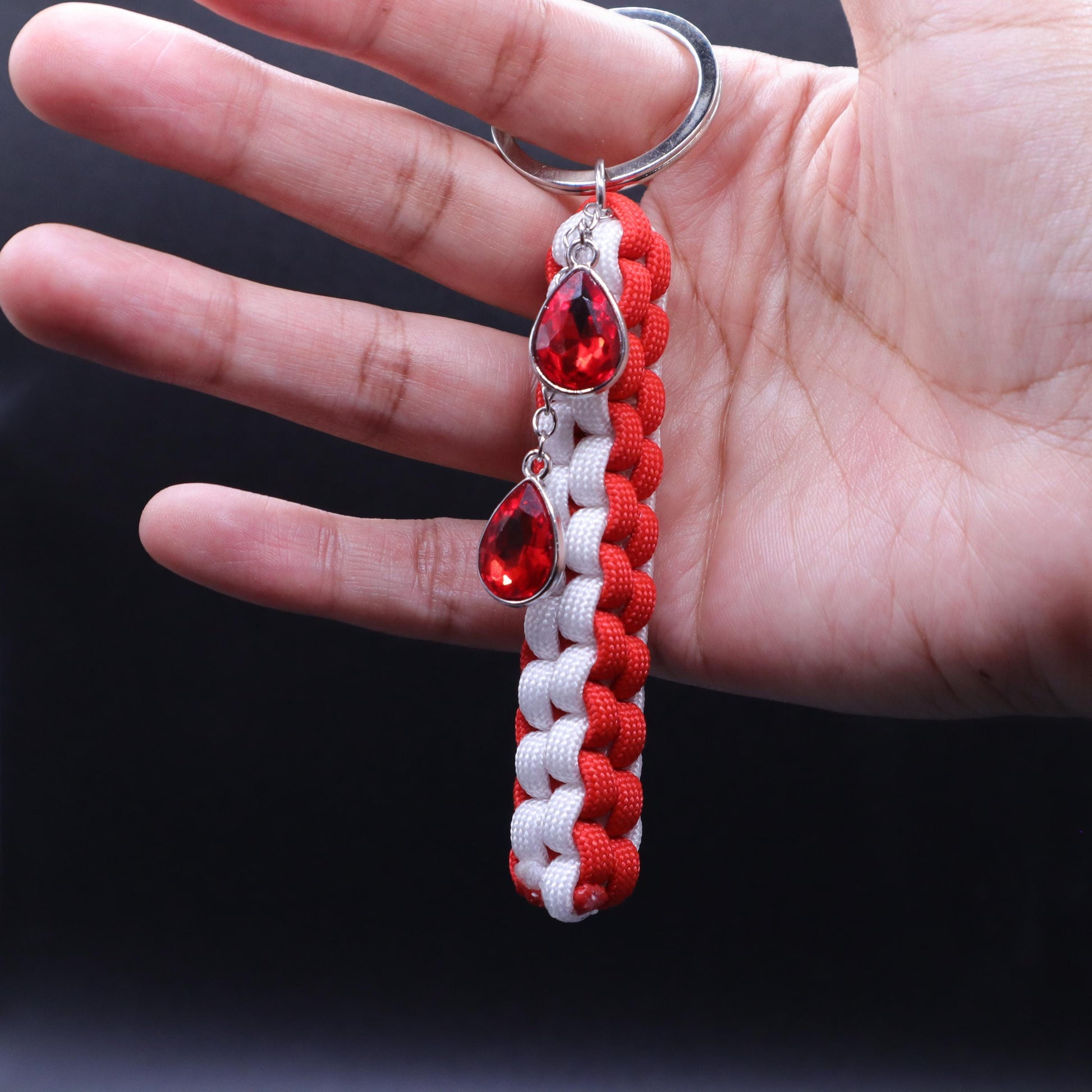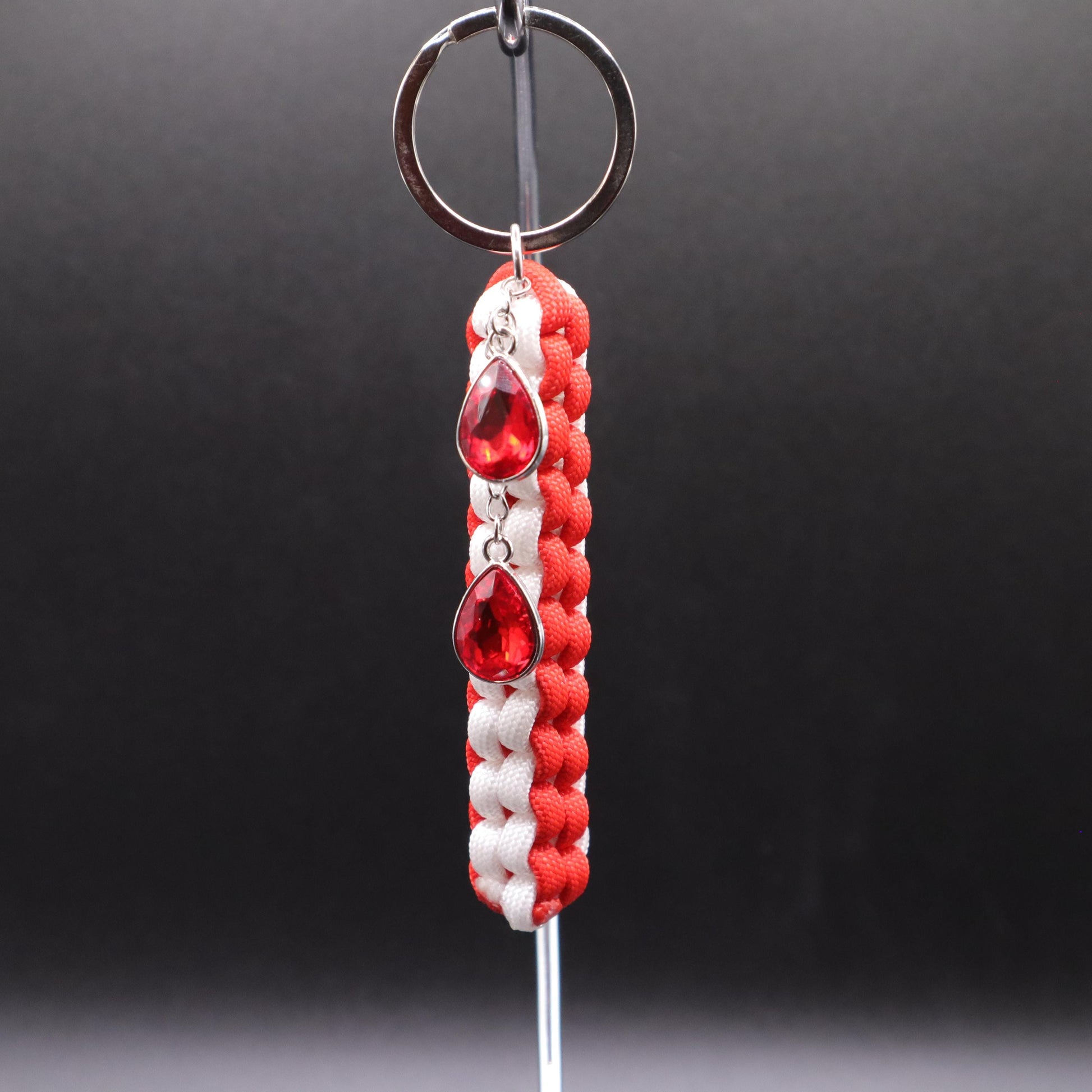 Handmade paracord keychain with red teardrop charms. This is the perfect accessory for your keys, backpack, purse, or camping equipment.